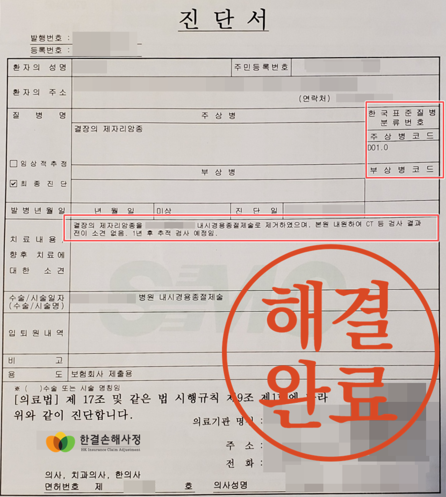 보험금 손해사정은 대장암 기준으로 진행,