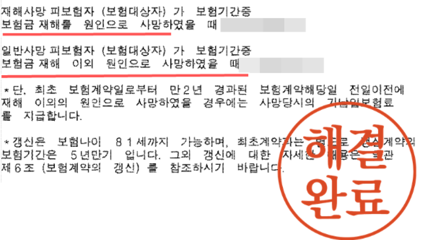 위 사례도 질병과 재해모두가 사망에 영향을 준 것으로 사망진단서 등이 발행되었지만 재해를 직접적인 원인으로 사망하였음을 입증, 재해사망 기준으로 보험금 처리를 완료하였습니다.