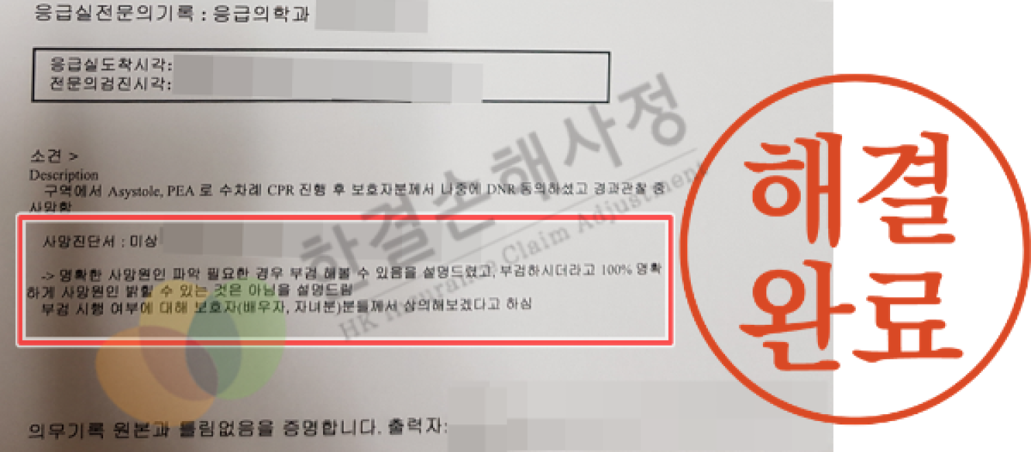 응급의학과 전문의는 사인을 알 수 없으며 사망의 원인에 미상, 사망의 종류에 기타 및 불상이라는 사망진단서를 유족에게 발급하였습니다.