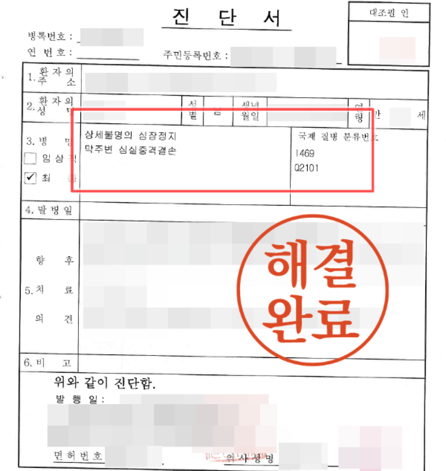 상세불명의 심장정지 발생으로 인한 인과관계 여부
