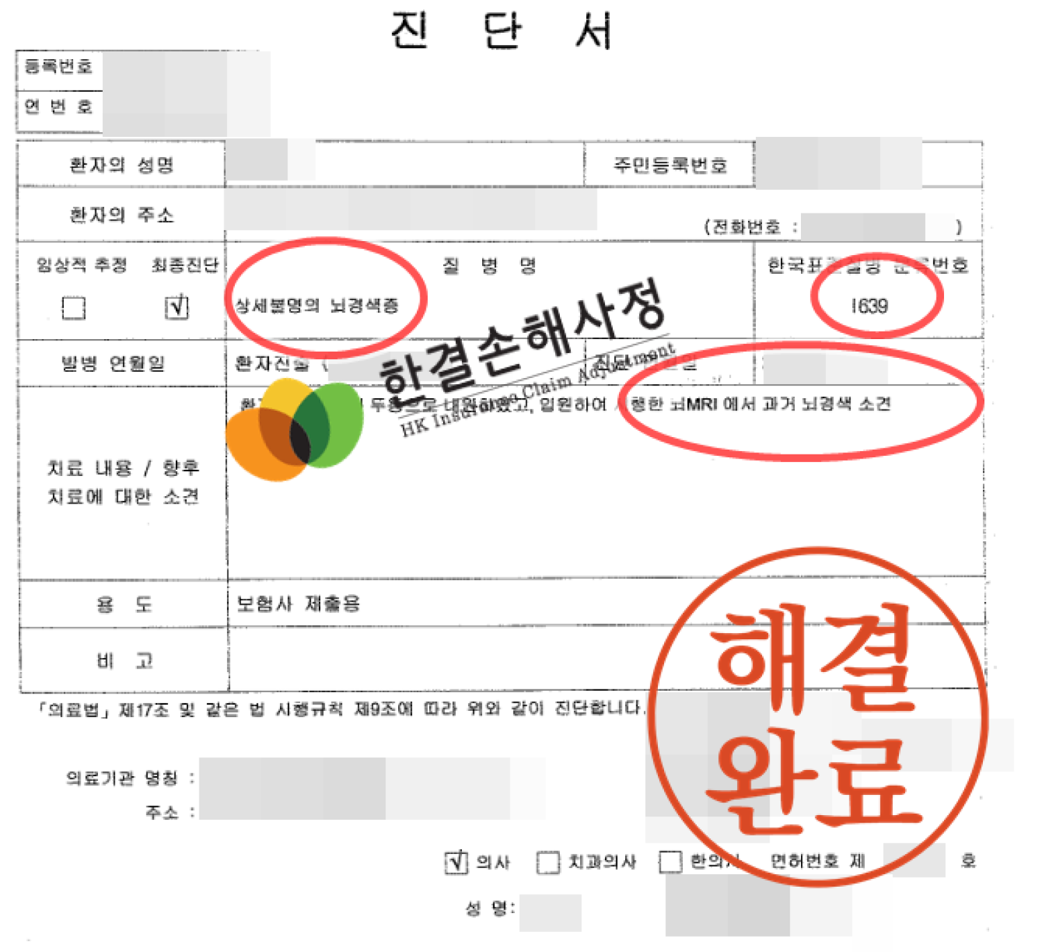 진단서 상 현재 발생한 뇌경색이 아닌 과거 뇌경색 소견이 있어 진단명 부여