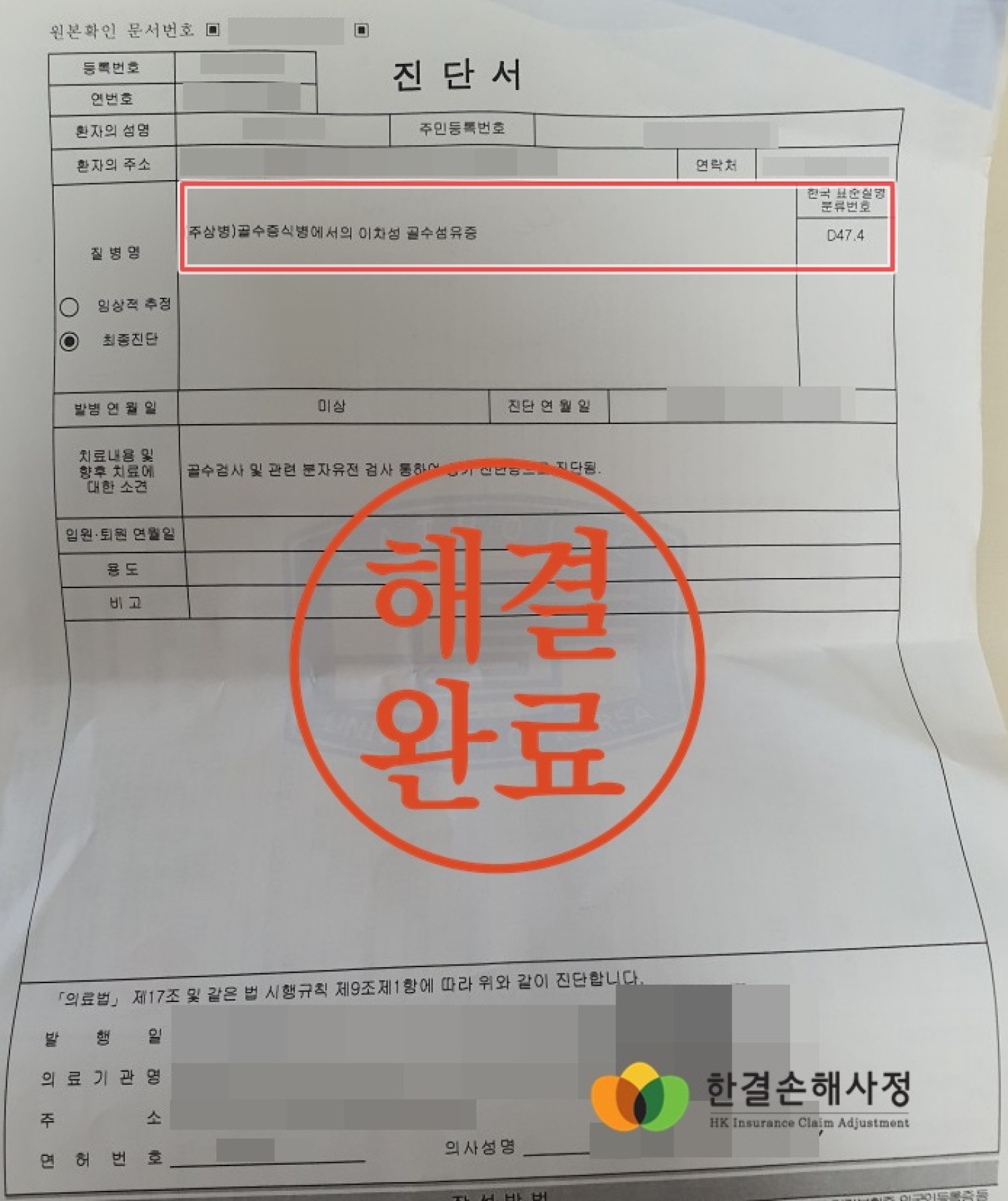 보험 가입 전 혈액암 진단이 되었고 가입 이후까지 골수검사 및 치료, 정기검사를 받은 사실을 보험회사가 확인함.