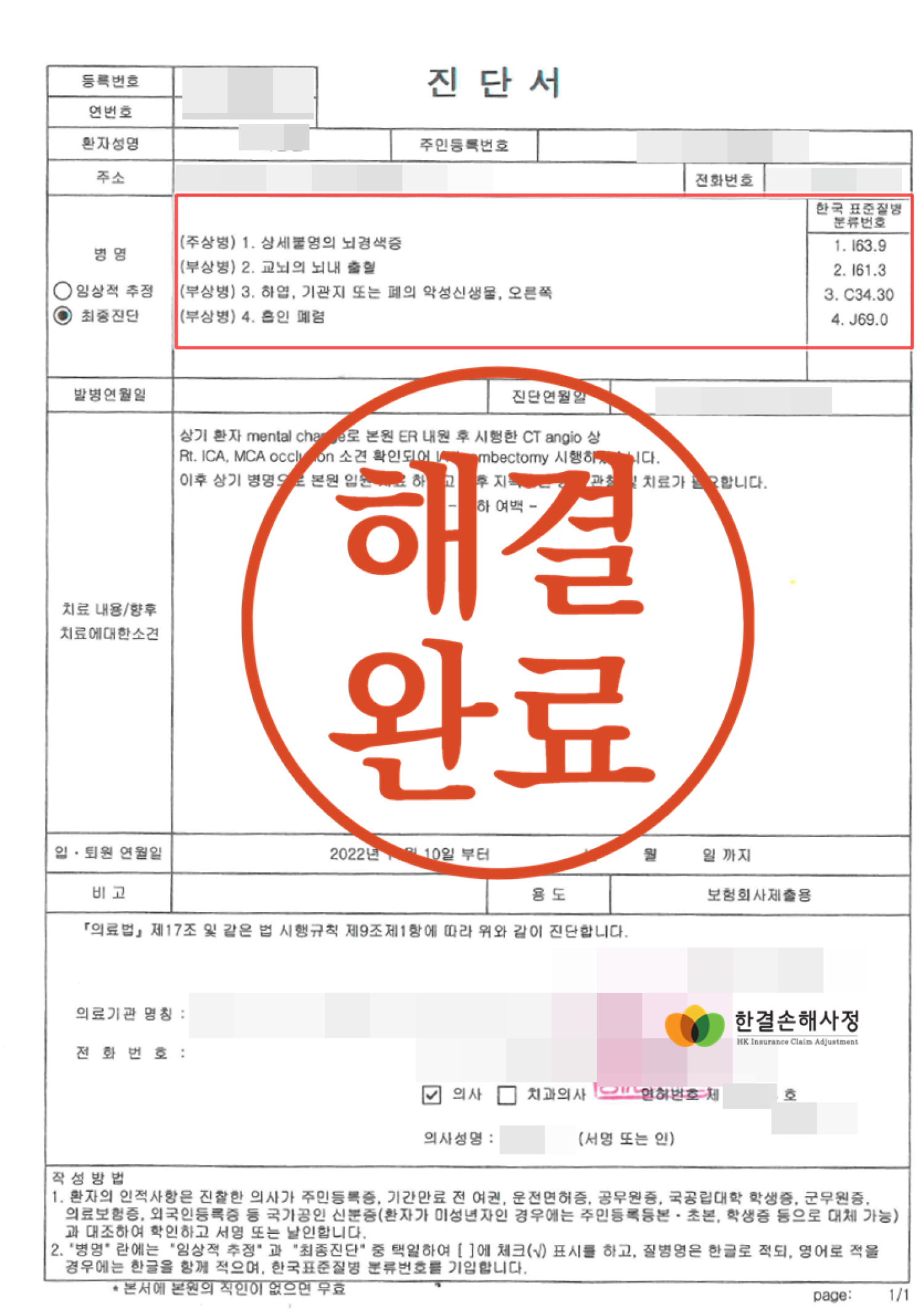 의사의 뇌출혈 진단은 적합하고 보험 약관에서 인정되는 뇌출혈 진단을 받은 것을 명확하게 입증하여 손해사정서 및 근거를 제출하였고