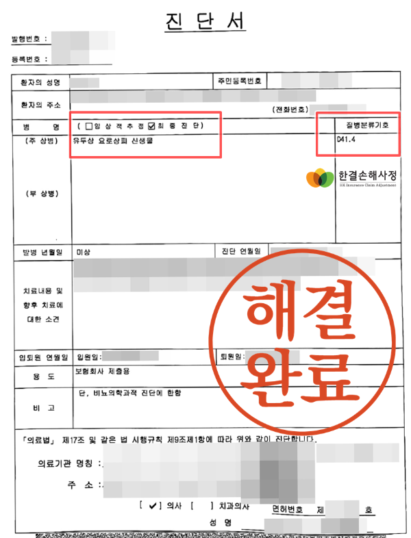 여러 병원 검사 기록 등을 검토하여 방광암 진단을 받은 것으로 볼 수 있다는 손해사정서 및 근거 등을 제출, 시간은 걸렸지만 최종 방광암 보험금이 가입자에게 처리된 사건입니다.