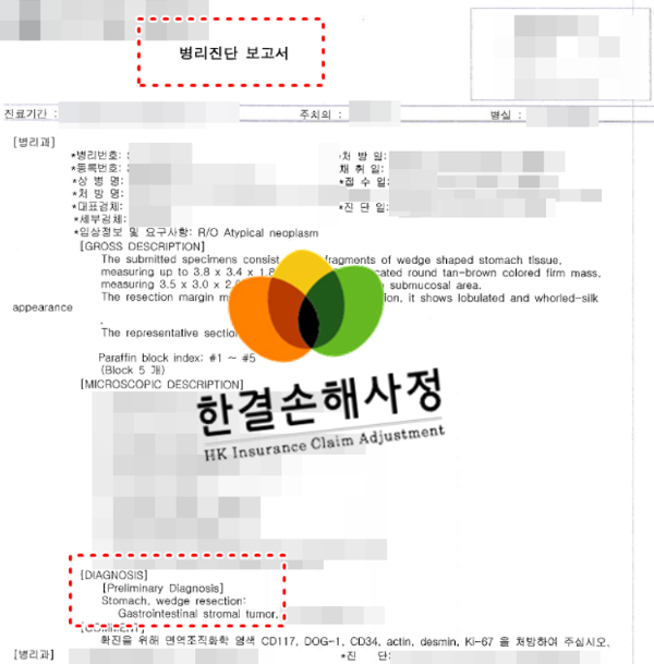 해당 사건도 위장관기질종양이며 경계성 판정이 되었지만 의사의 진단과 관계없이 일반암 기준의 손해사정을 진행, 보험금을 C코드 기준으로 처리한 사례입니다.