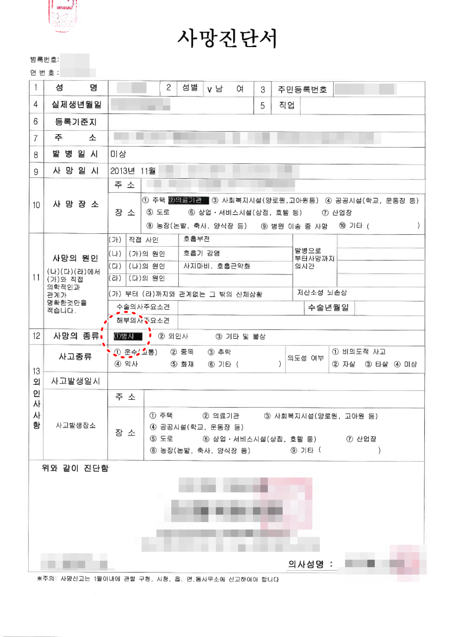 이번 사례 또한 전형적인 병원측에서의 사망진단서 발급과정에서의 오류로, 분명 외상으로 입원했고 그 치료과정에서 합병증 또는 치료과정에서의 자연스러운 질병으로 사망했다는 이유로 '병사'로 발급을 했고, 사망의 원인 또한 모두 질병과 관련된것으로 기재되었습니다.