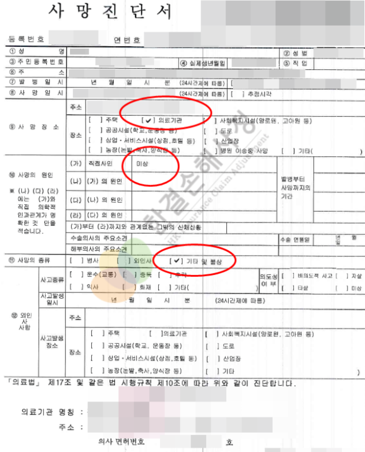 사망진단서에 표기된 내용은 직접사인 = 미상, 사망종류 = 기타 및 불상입니다.