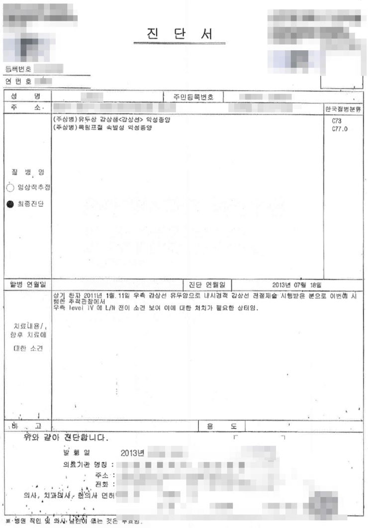 갑상선암으로 진단받고 수술을 한 경우 의외로 주변 림프절로의 전이가 된 경우가 많습니다. 이 경우 수술시 함께 제거를 하는경우가 대부분이기 때문에 크게 신경을 안쓰는 경우가 많습니다. 진단서 내용에서 뿐만 아니라 수술 후 주치의와의 상담에서도 림프절로의 전이가 되었다는 설명을 못받는 경우도 많습니다.