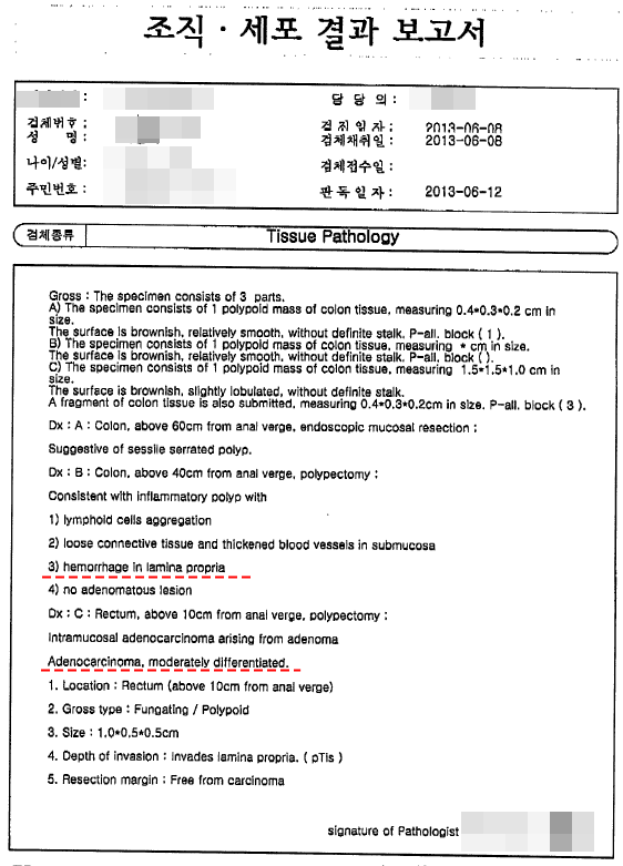 또한 이런 상피내암, 제자리암종은 크게 위험하다는 판단을 하지 않는 의사도 있기때문에 떼어낸 용종의 정확한 진단을 알려주지 않는 경우도 있습니다.