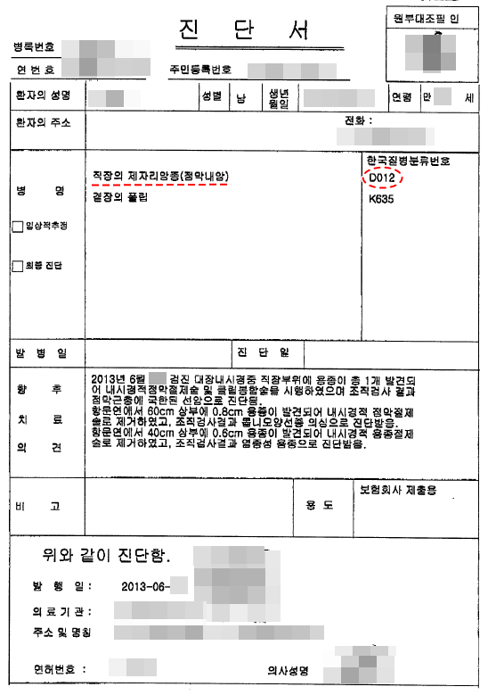 이번 성공사례에서와 같이 상기 진단서를 보면 직장의 제자리암종으로 'D01.2'로서 분명히 약관에서 정하는 제자리암진단비만 해당됩니다.